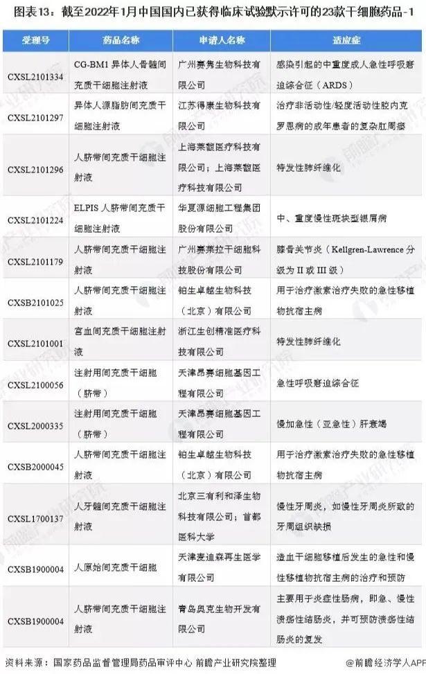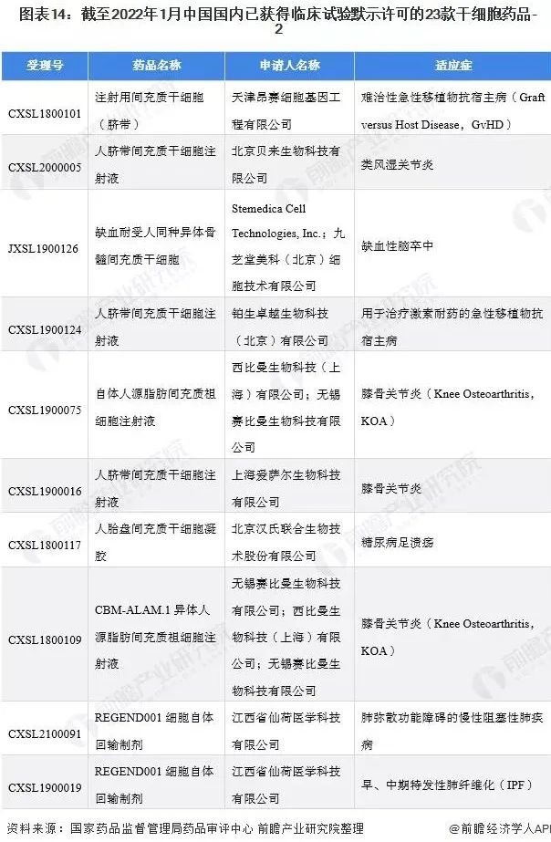在干細胞臨床應用方面,根據(jù)國家藥品監(jiān)督管理局藥品審評中心(CDE)公示信息顯示,截止2022年1月5日,共有23個干細胞新藥項目獲得國家臨床默示許可。分別是胎盤、臍帶、骨髓、牙髓、宮血、異體/自體脂肪來源的間充質(zhì)干細胞,適應證包括了膝骨關(guān)節(jié)炎、類風濕關(guān)節(jié)炎、糖尿病足潰瘍、肺纖維化、肝衰竭、卒中、急性呼吸窘迫綜合征、牙周炎、克羅恩病和GvHD等。